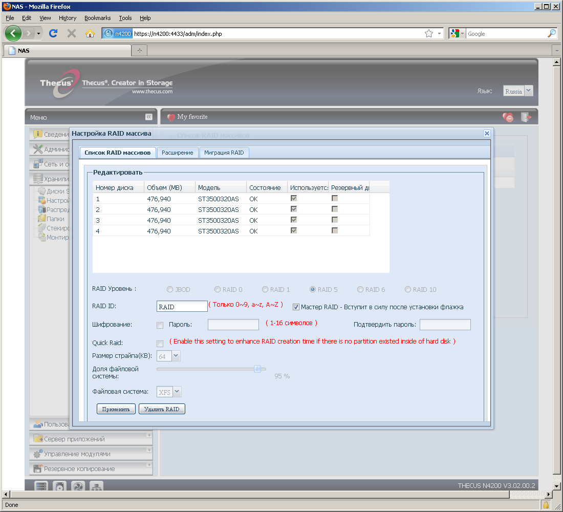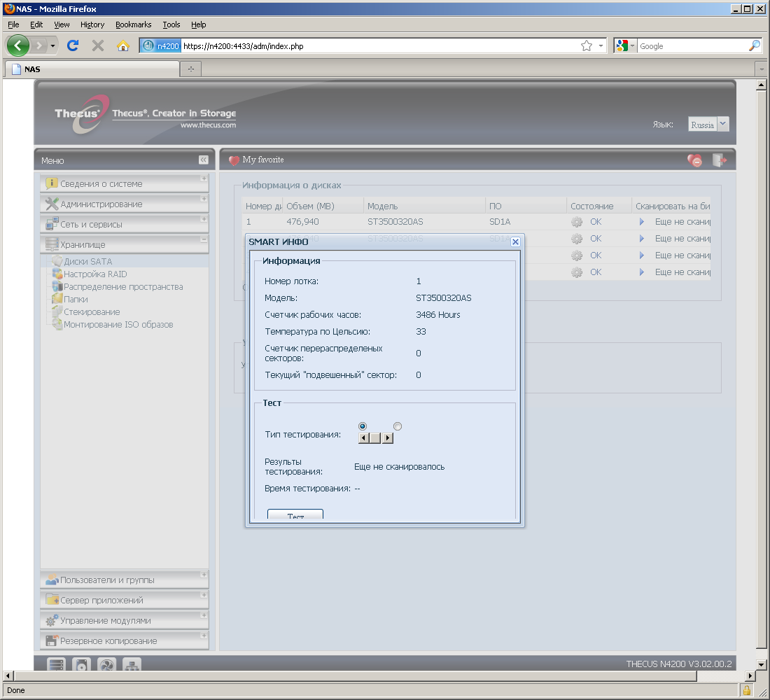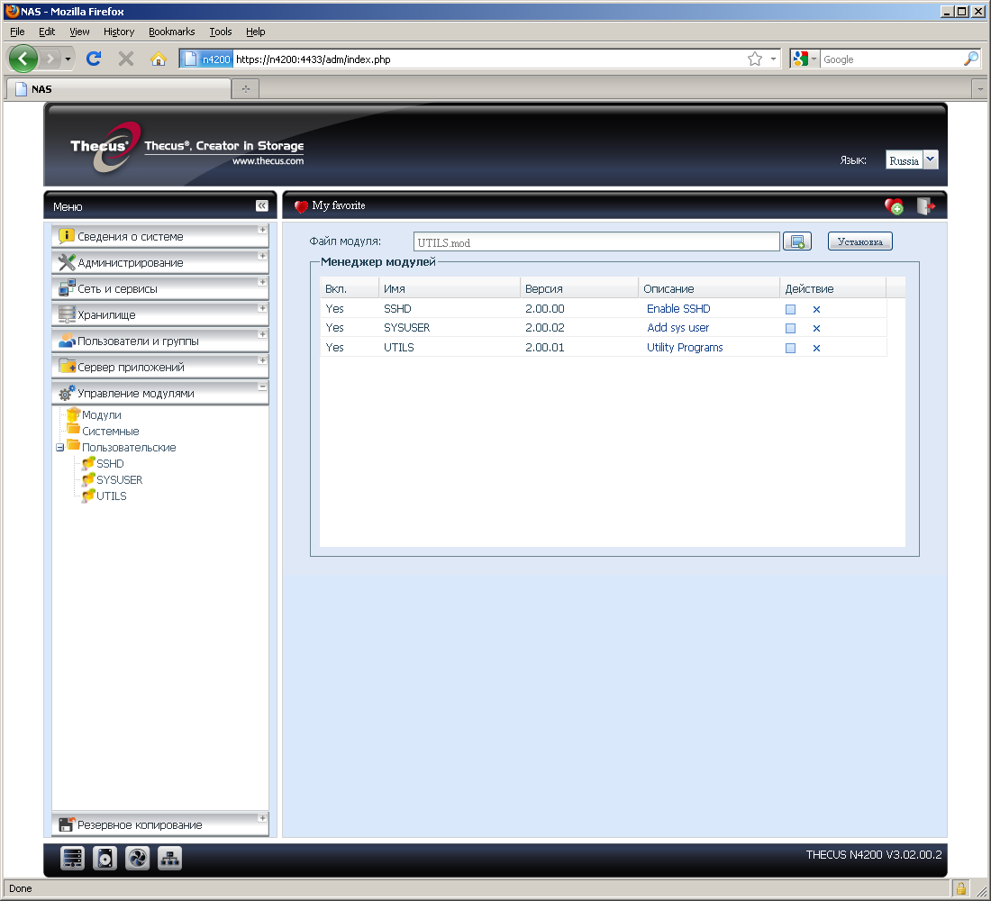 Отдельные страницы посвящены установке и управлению дополнительных программных модулей от Thecus. Их возможности будут описаны позже в соответствующем разделе статьи.